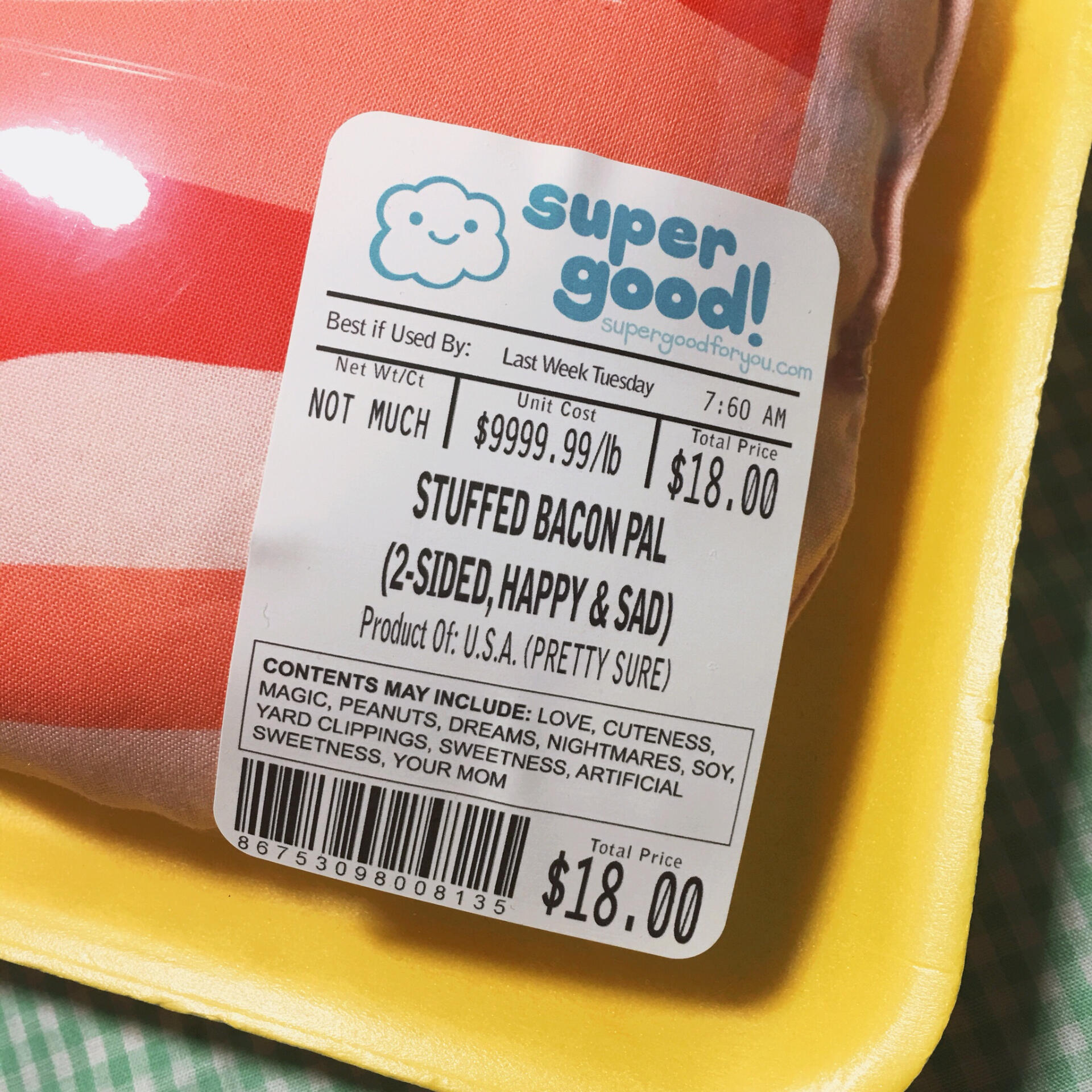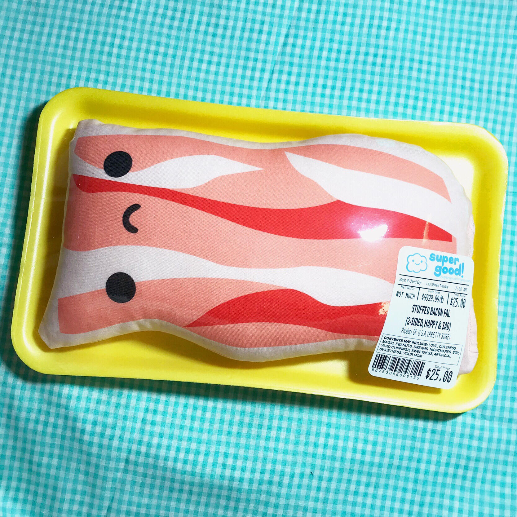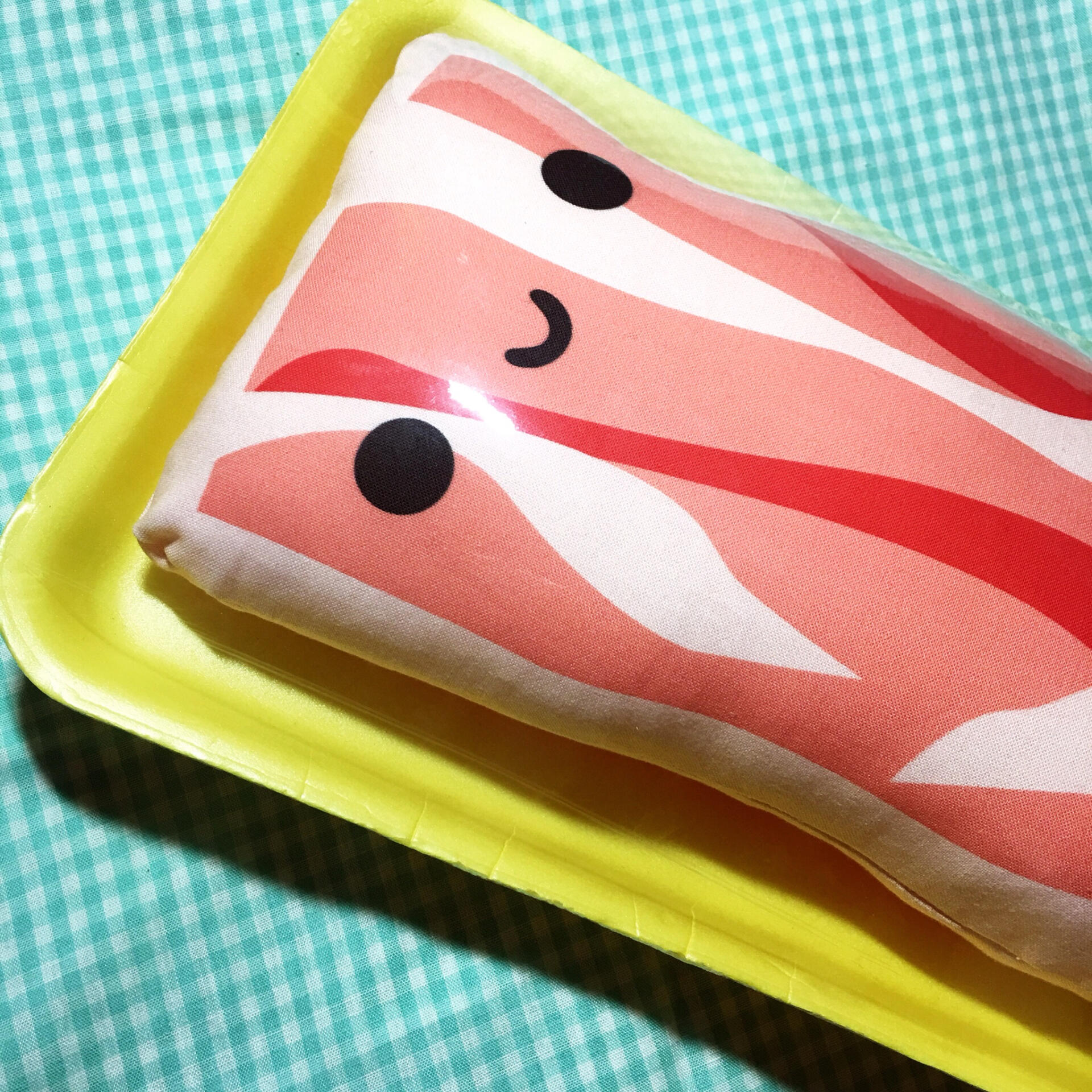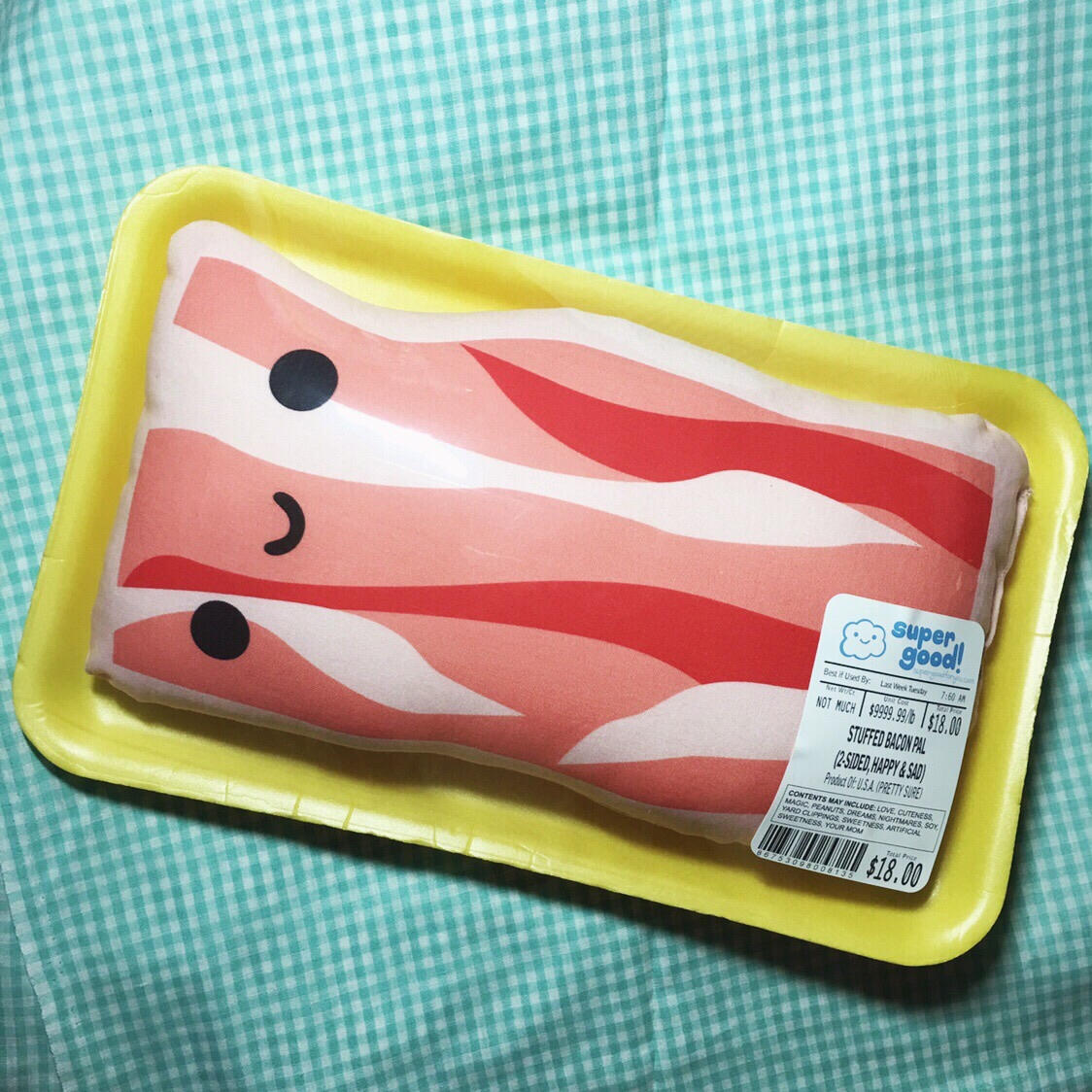 Handmade stuffed bacon pillow, two-sided, one happy, one sad!Enjoy him inside or outside his packaging! (the label is peelable/re-stickable if you want to change which side is displayed!)Measures approx. 11” x 6”