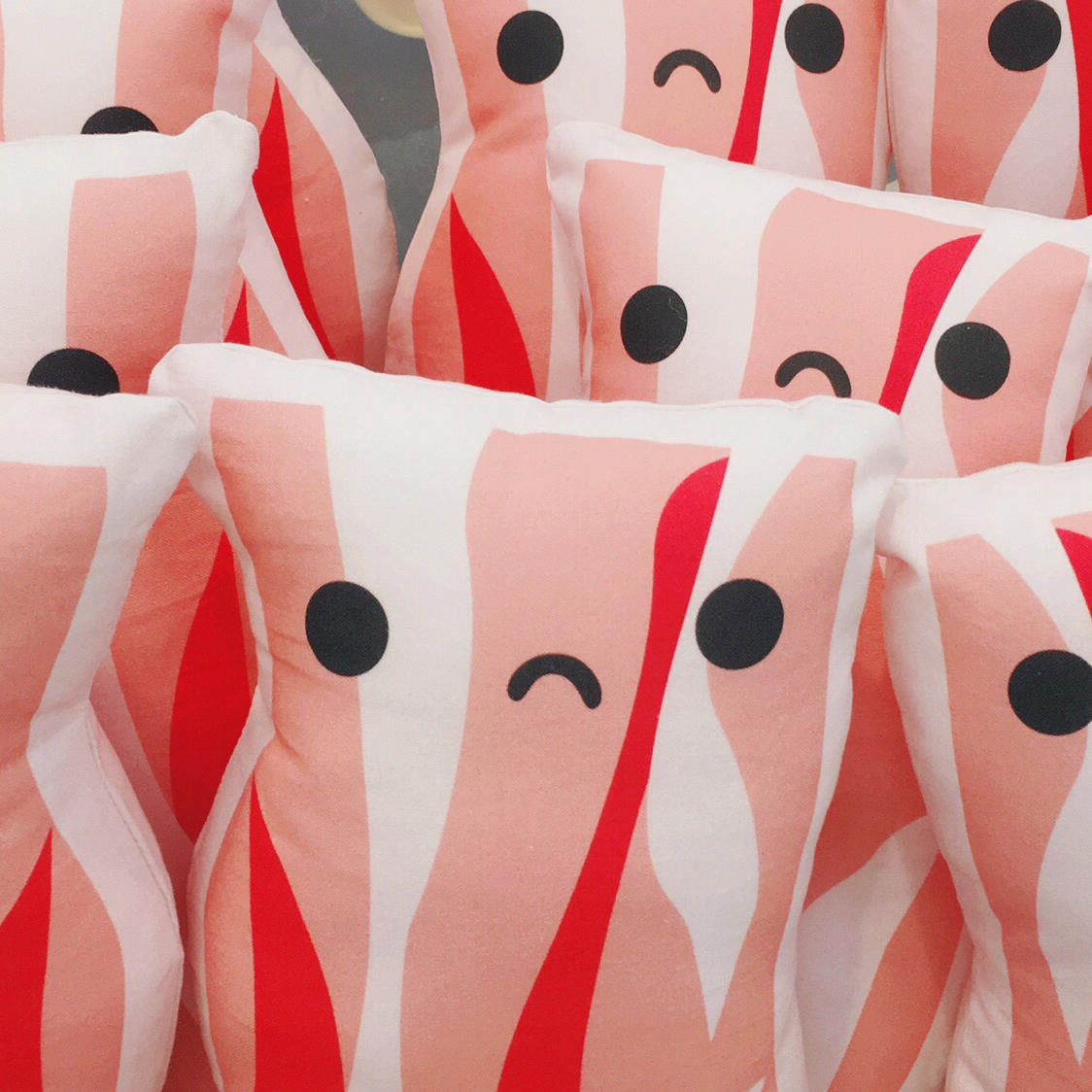 Handmade stuffed bacon pillow, two-sided, one happy, one sad!Enjoy him inside or outside his packaging! (the label is peelable/re-stickable if you want to change which side is displayed!)Measures approx. 11” x 6”Please specify in the pulldown menu below if you would like the happy or sad side facing up in the packaging :) Otherwise the happy side is default.