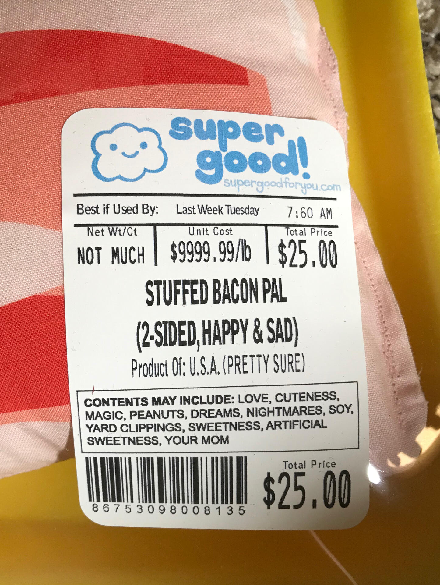 Handmade stuffed bacon pillow, two-sided, one happy, one sad!Enjoy him inside or outside his packaging! (the label is peelable/re-stickable if you want to change which side is displayed!)Measures approx. 11” x 6”Please specify in the pulldown menu below if you would like the happy or sad side facing up in the packaging :) Otherwise the happy side is default.
